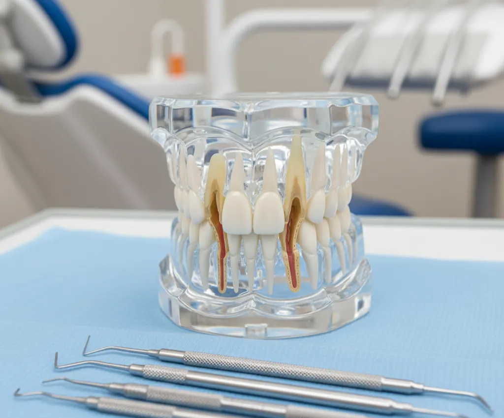 نستخدم الأدوات الدقيقة لتنظيف القنوات الداخلية وإزالة البكتيريا بالكامل.